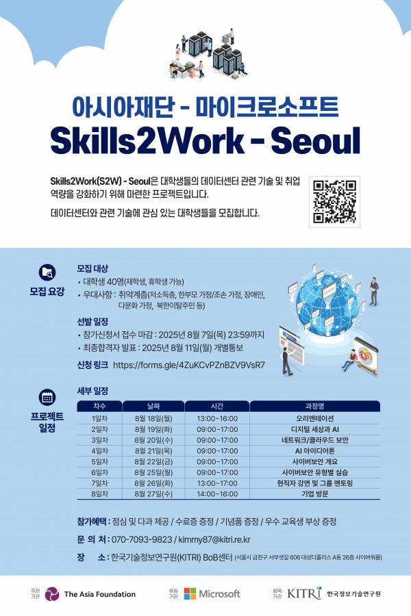 Skills2Work(S2W) Seoul은 대학생 대상으로 데이터센터 관련 기술 및 취업 역량을 강화하기 위해 고안된 교육과정입니다. 데이터센터 및 관련 기술에 관심 있는 대학생들을 모집하오니 많은 관심 부탁드립니다.