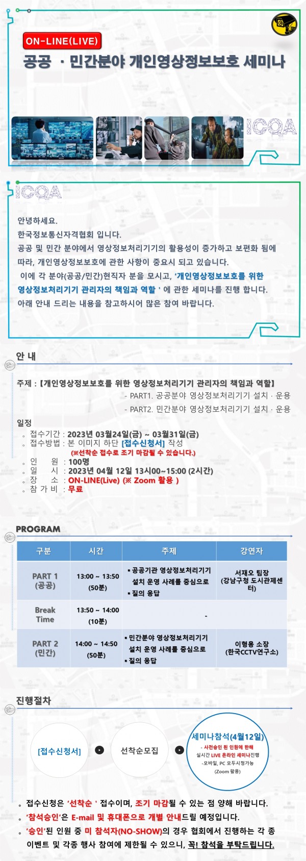 [ICQA] "공공·민간분야 개인영상정보보호 온라인 세미나" 접수 마감 > 공지사항